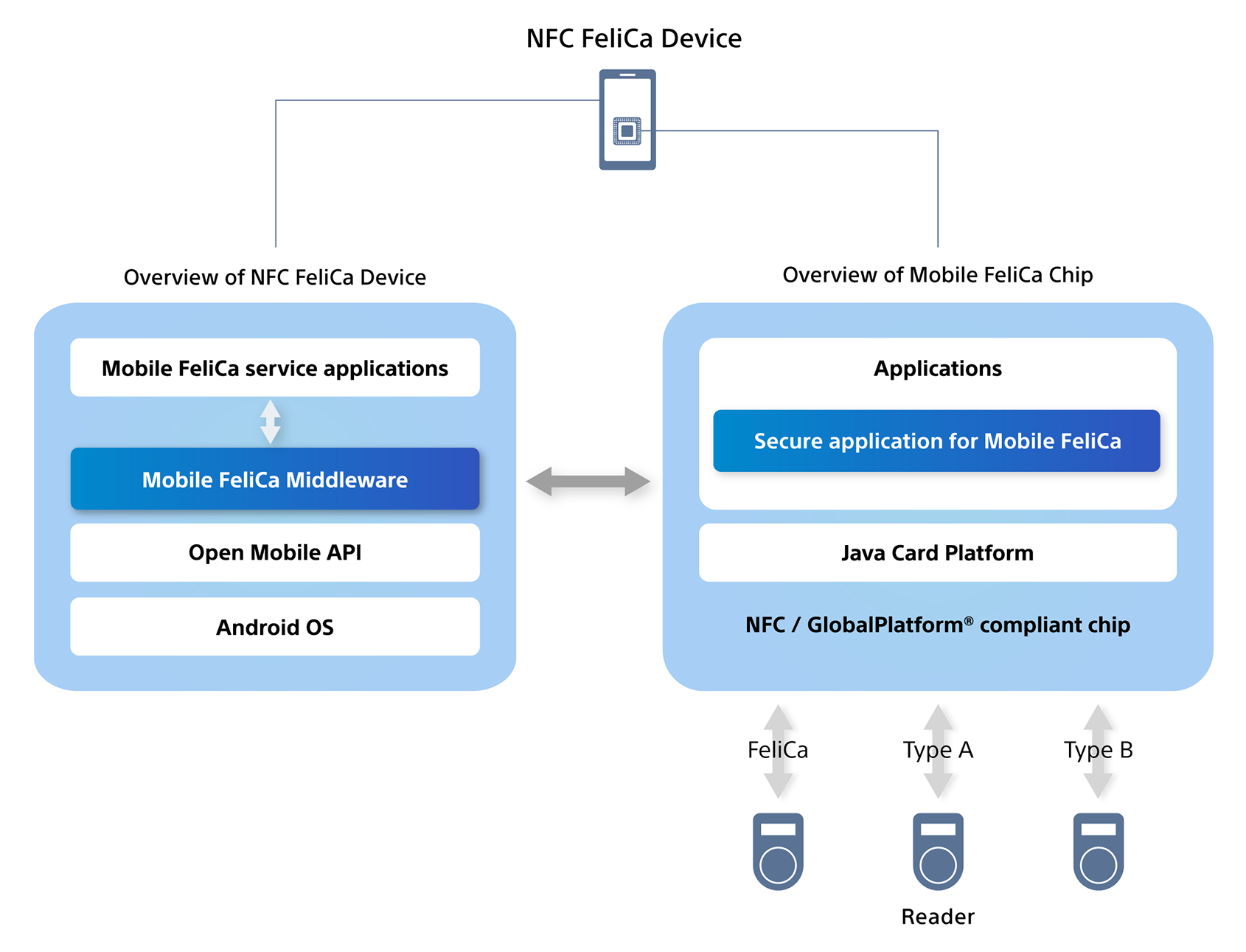 Mobile FeliCa functions are realized as an application developed by FeliCa Networks and securely managed as a secure application that runs on the Java Card platform in a secure element compliant with the GlobalPlatform® specification.